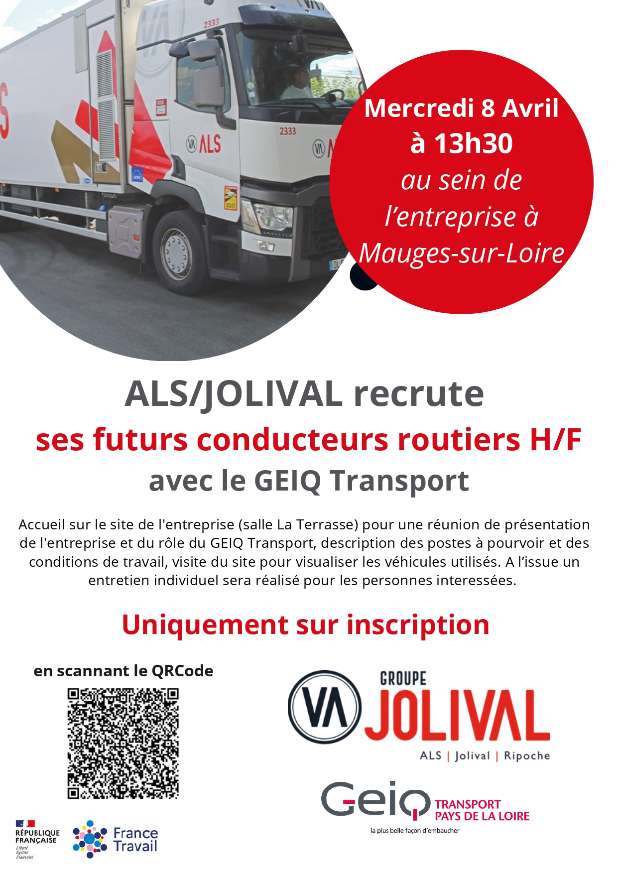 Les Transports Jolival et ALS (groupe Jolival) en collaboration avec France Travail Beaupréau et le GEIQ Transport organisent 𝐮𝐧𝐞 𝐢𝐧𝐟𝐨𝐫𝐦𝐚𝐭𝐢𝐨𝐧 𝐜𝐨𝐥𝐥𝐞𝐜𝐭𝐢𝐯𝐞 afin de présenter les opportunités de recrutement.