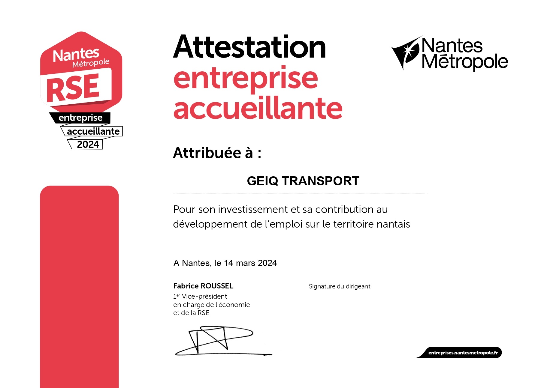 Le GEIQ Transport est fier d’être de nouveau reconnue « Entreprise Accueillante » en 2024 et de poursuivre la dynamique soutenue par la plateforme RSE de la métropole nantaise et dans laquelle l’@Atdec Nantes Métropole est partie prenante ![]()